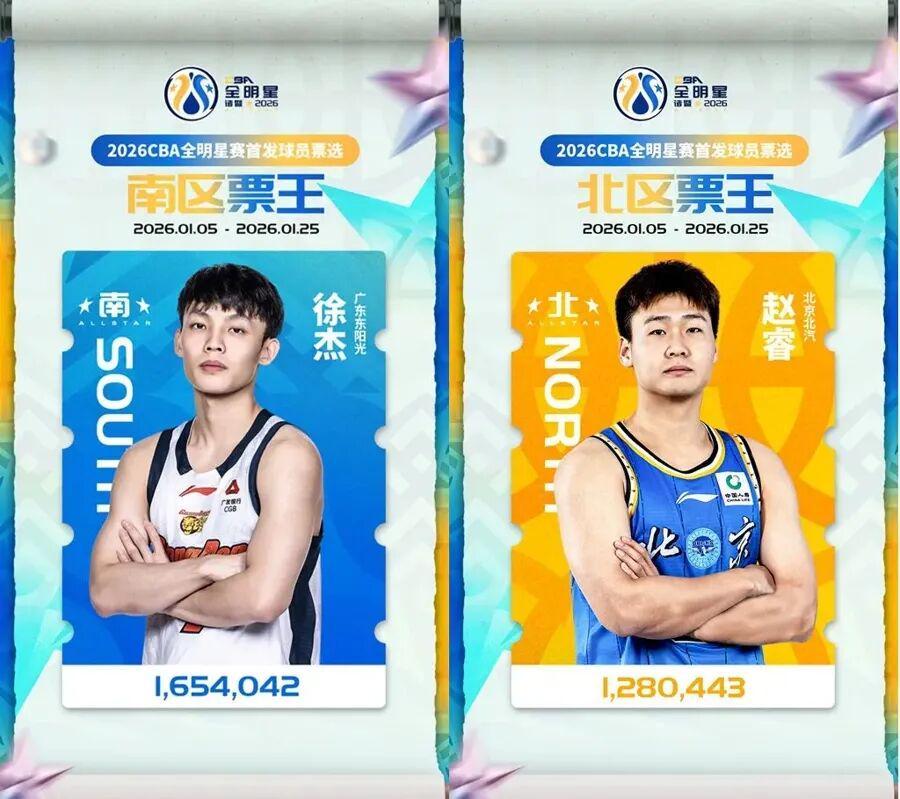 CBA联赛官方昨天公布了2026年CBA全明星赛首发球员票选结果。广东队后卫徐杰以1,654,042票当选南区票王及总票王,北京队后卫赵睿则以1,280,443票荣膺北区票王。